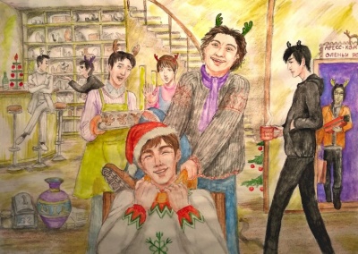 Каждый год мы с друзьями моими тараканами идём в баню рисовать один и тот же рисунок. Подозреваю, что ноги растут из детства: у меня была пара тетрадей, где на каждой странице я рисовала какой-нибудь объект - балерину, лебедя, обледеневшие цветы, оленей (очень больная тема) и прочее. Раз в полгода-год я перелистывала тетради и, если мне не нравилось то, что я видела, я перерисовывала объект рядом с первым. Такая вот рисовалка-тренировалка, показывающая уровень роста моих рисовальных навыков.
